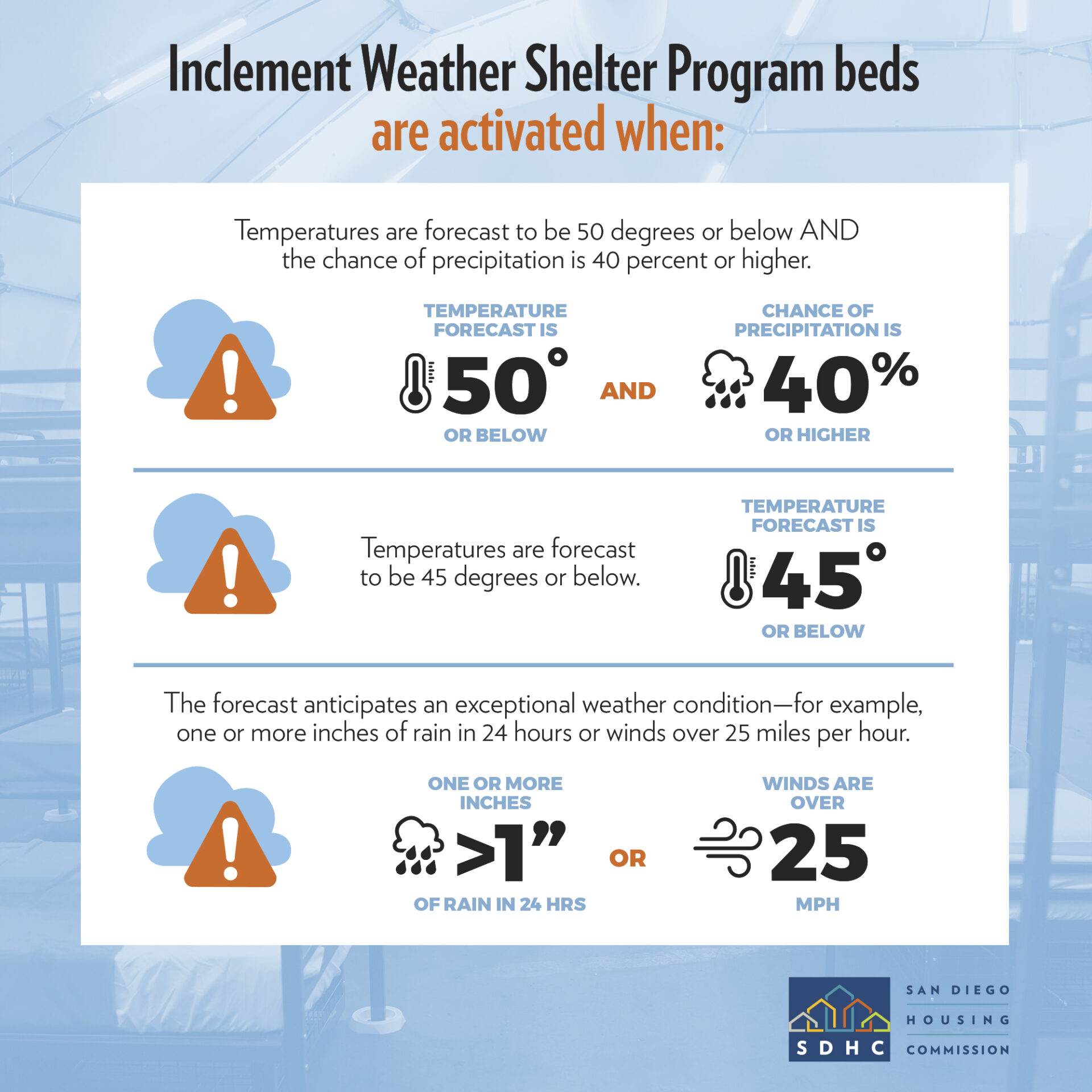 SDHC continued to collaborate with the City of San Diego, Father Joe’s Villages, and Living Water Church of the Nazarene to provide additional shelter beds during times of bad weather. A determination about the inclement weather shelter beds is made each day from November through March, based on the forecast and in consultation with service providers about their staffing and capacity.