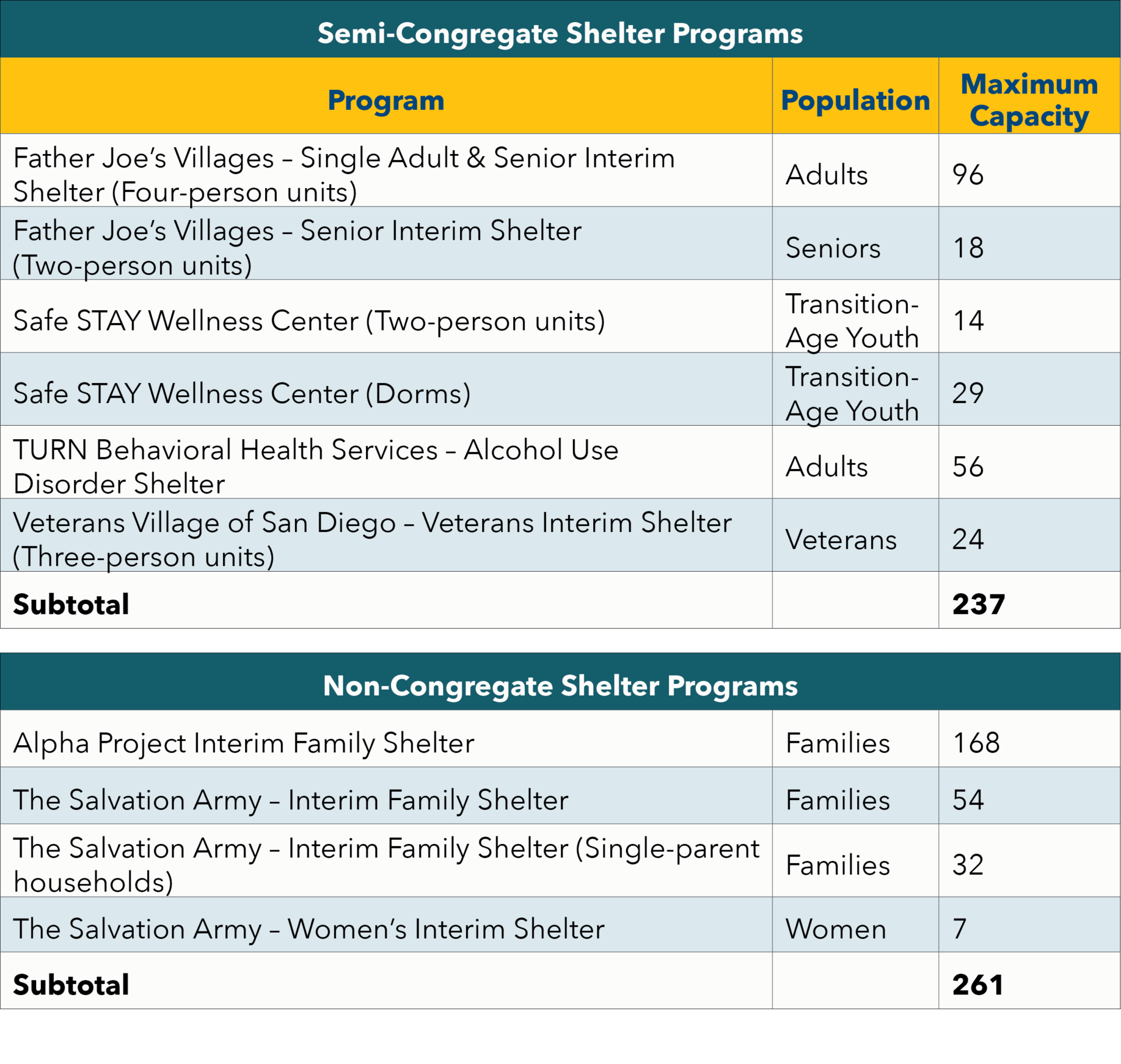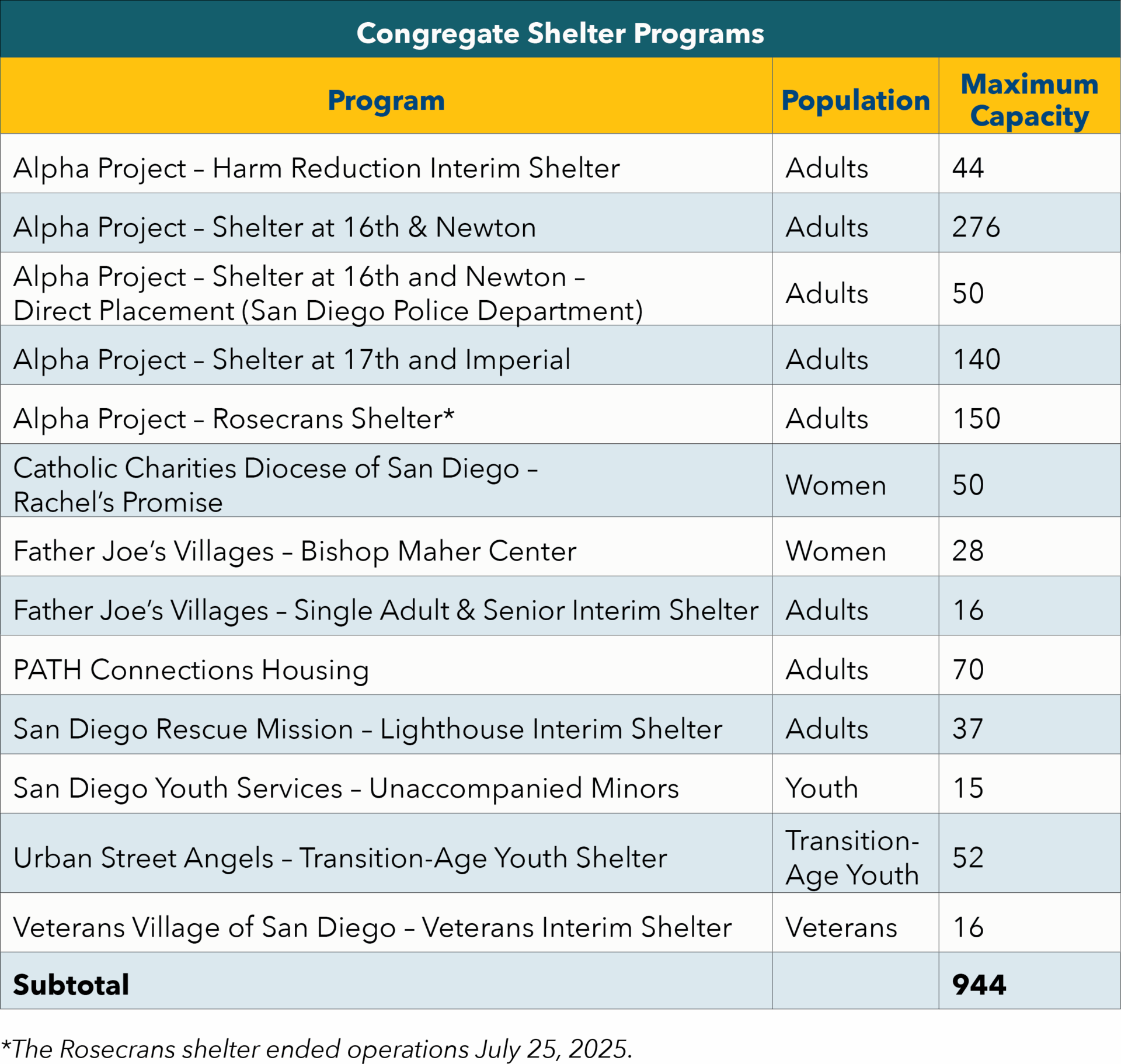 A package of new initiatives was announced in October 2024 to expand shelter and the options to address participants’ individual needs and provide a path toward resolving their homelessness. The new initiatives included adding beds to the shelter system at the Veterans Village of San Diego campus and through the San Diego Rescue Mission and TURN’s Alcohol Use Disorder program, as well as implementing a shelter-focused homelessness diversion effort to free up additional beds. These initiatives were the result of the Short-Term Action Plan on Homelessness that the City Council asked the City’s Homelessness Strategies and Solutions Department and SDHC to develop. The action plan was approved October 1, 2024.